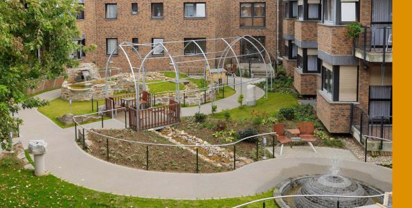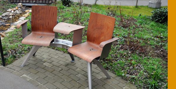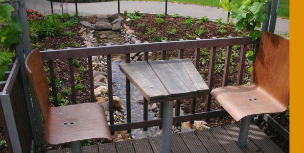 Für diesen Garten wurde außerdem ein spezielles Sitzmöbel entwickelt, welches den ergonomischen Erfordernissen für Senioren gerecht wird und durch die gewinkelte Anordnung der Sitzplätze auch Menschen mit eingeschränkter Beweglichkeit zur Kommunikation einlädt.