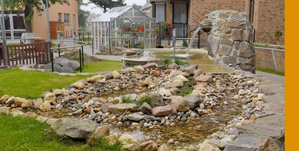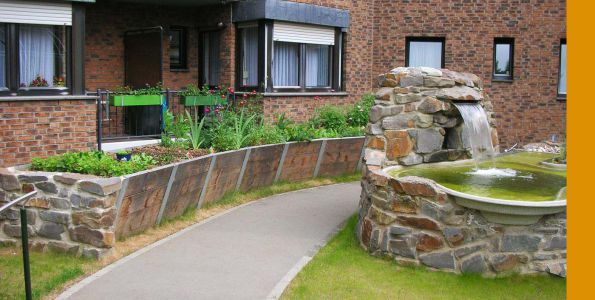 Gestaltung eines 'Gartens der Sinne' für das Altenzentrum St. Hildegard in Jülich. Der Sinnesgarten ist insbesondere auf demenzkranke Bewohner ausgelegt. So sind die Wege in Schleifen verlegt, gesäumt von Zitaten aus der Vergangenheit, um die Erinnerungen anzuregen. Der Teich mit Wasserfall ist hochgelegt, um auf diese Weise auch für Rollstuhlfahrer erreich- und 'begreifbar' zu sein.