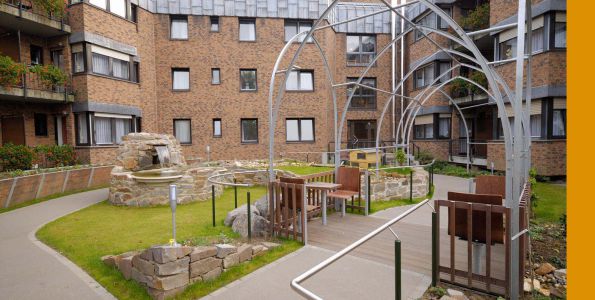 Für diesen Garten wurde außerdem ein spezielles Sitzmöbel entwickelt, welches den ergonomischen Erfordernissen für Senioren gerecht wird und durch die gewinkelte Anordnung der Sitzplätze auch Menschen mit eingeschränkter Beweglichkeit zur Kommunikation einlädt.