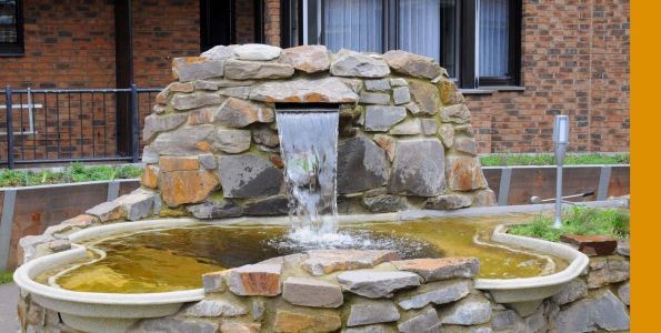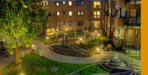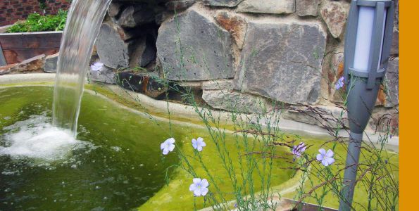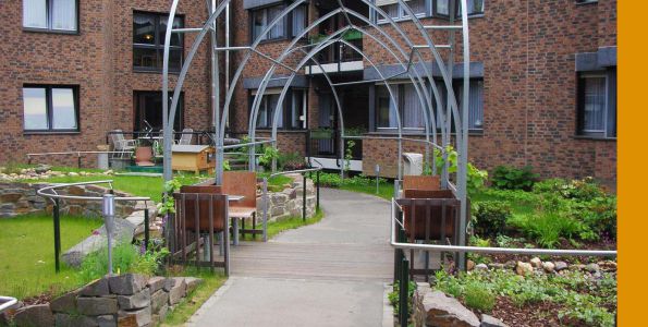 Gestaltung eines 'Gartens der Sinne' für das Altenzentrum St. Hildegard in Jülich. Der Sinnesgarten ist insbesondere auf demenzkranke Bewohner ausgelegt. So sind die Wege in Schleifen verlegt, gesäumt von Zitaten aus der Vergangenheit, um die Erinnerungen anzuregen. Der Teich mit Wasserfall ist hochgelegt, um auf diese Weise auch für Rollstuhlfahrer erreich- und 'begreifbar' zu sein.
